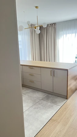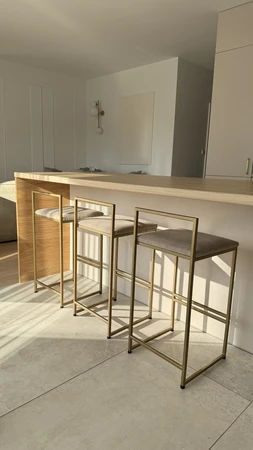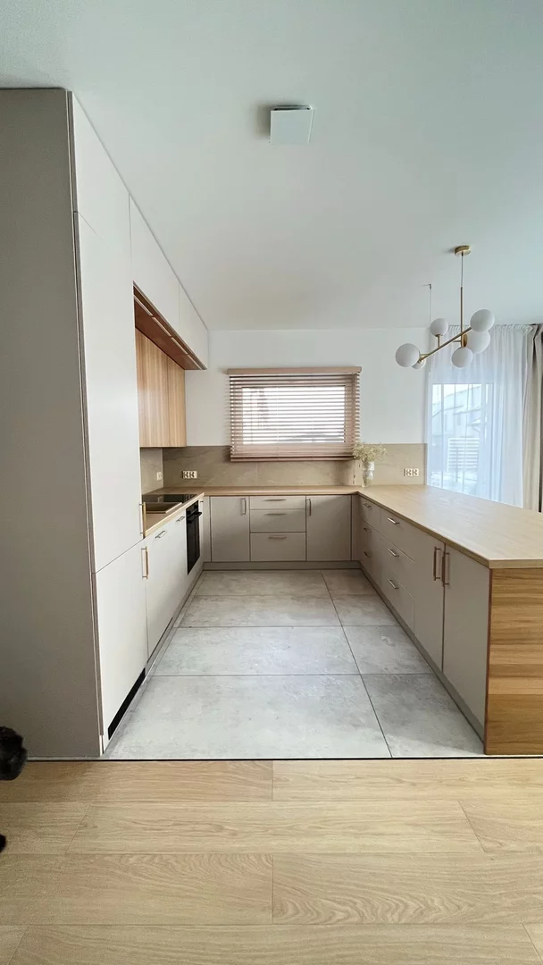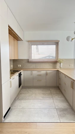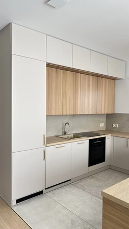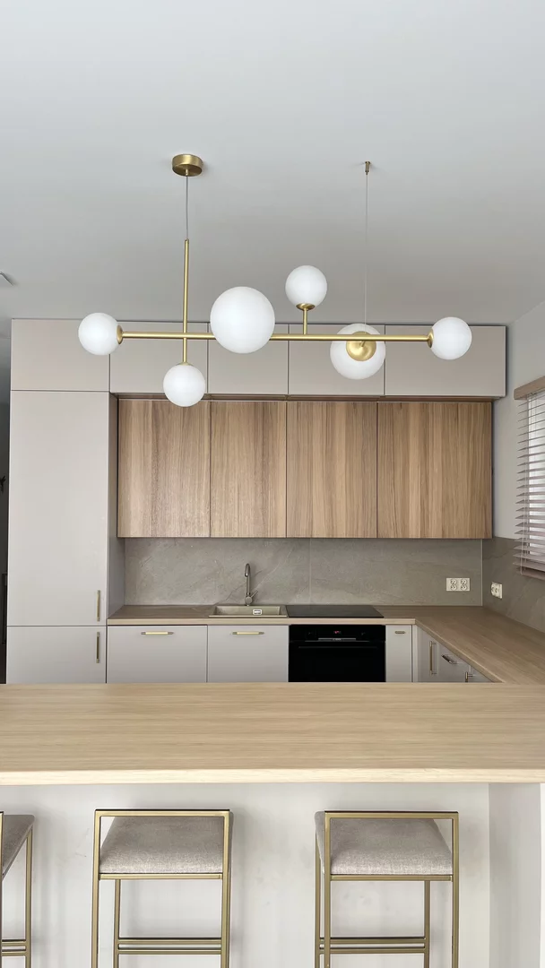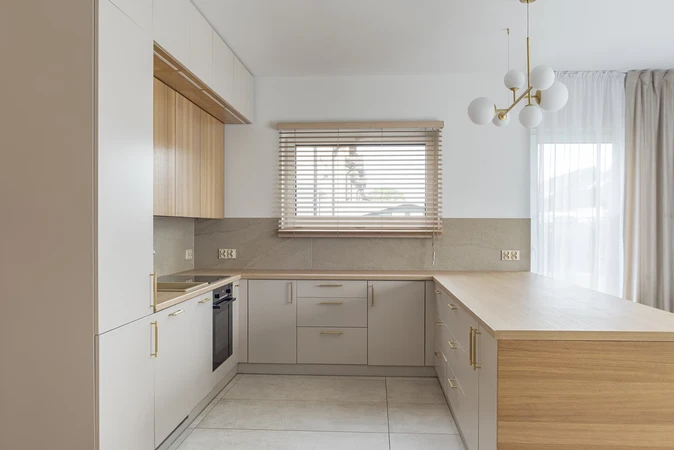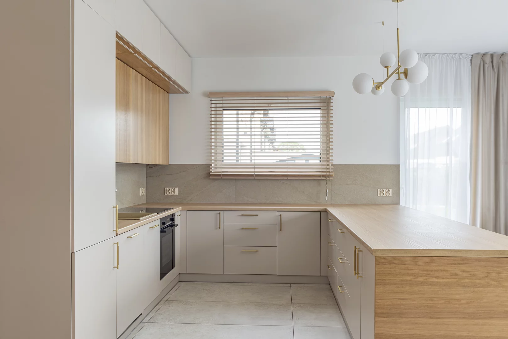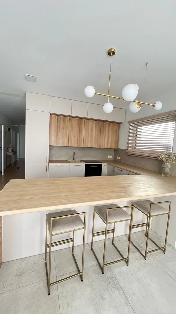 Minimalistyczna kuchnia o nowoczesnym designie, wyróżniająca się eleganckim połączeniem jasnego drewna i złotych akcentów. Nasze meble kuchenne tworzą spójną, stylową przestrzeń, która jest zarówno funkcjonalna, jak i estetycznie doskonała.