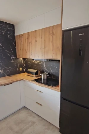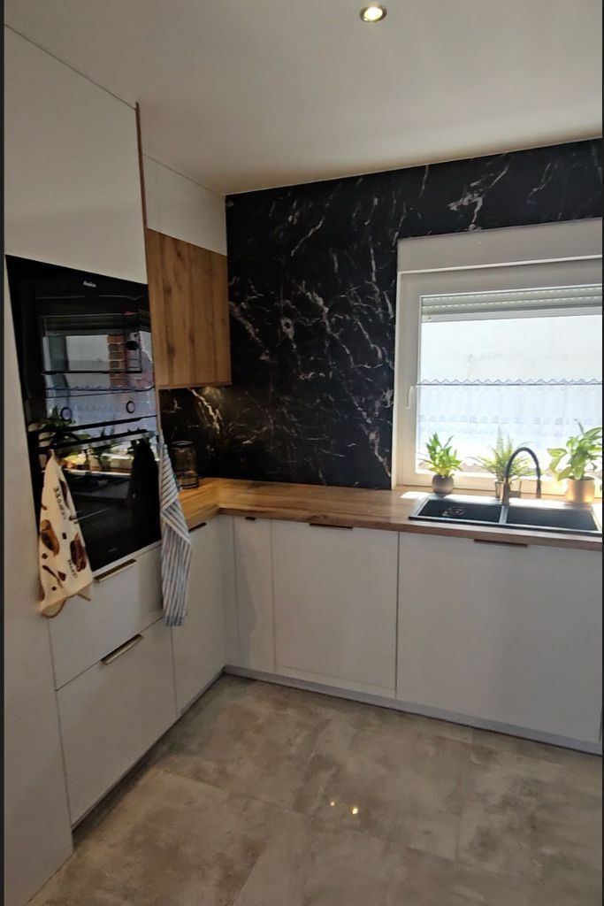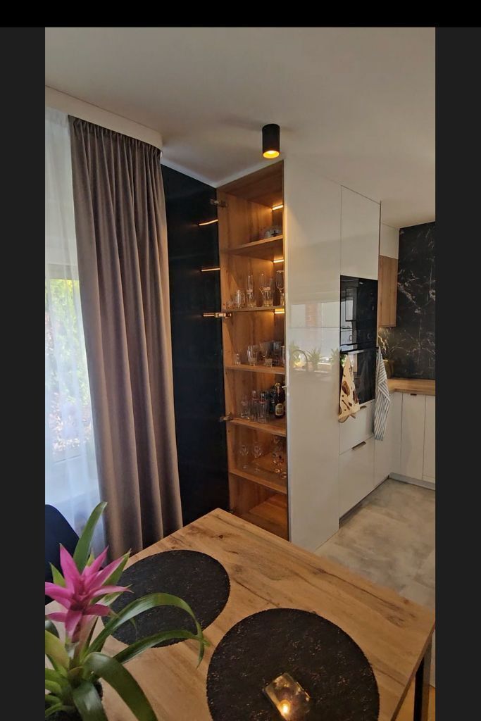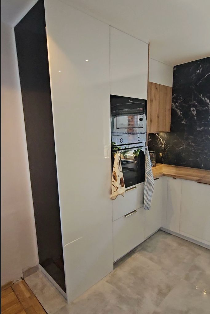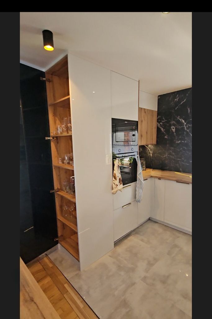 Przedstawiamy nowoczesną kuchnię z eleganckim, wbudowanym regałem na szkło, idealnie wkomponowanym w przestrzeń. Meble zostały wykonane z najwyższej jakości materiałów, co zapewnia funkcjonalność i stylowy wygląd na lata.