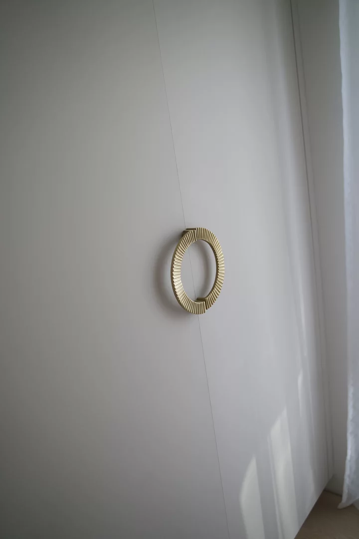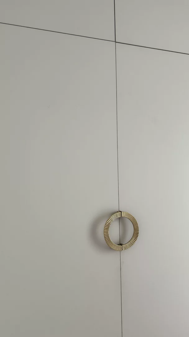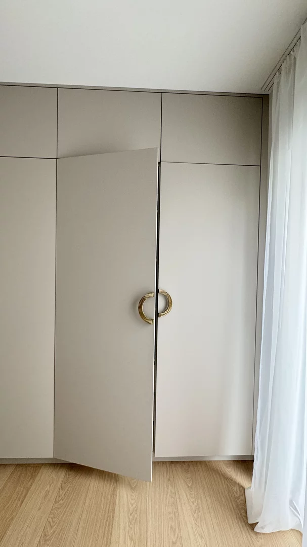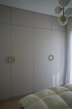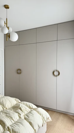 Całościenna zabudowa sypialni w eleganckim kolorze kaszmiru, wzbogacona o subtelne, złote ringi, które dodają wnętrzu wyjątkowego charakteru. Nasze meble łączą nowoczesny design z praktycznym wykorzystaniem przestrzeni, tworząc harmonijną i luksusową atmosferę w Twojej sypialni.