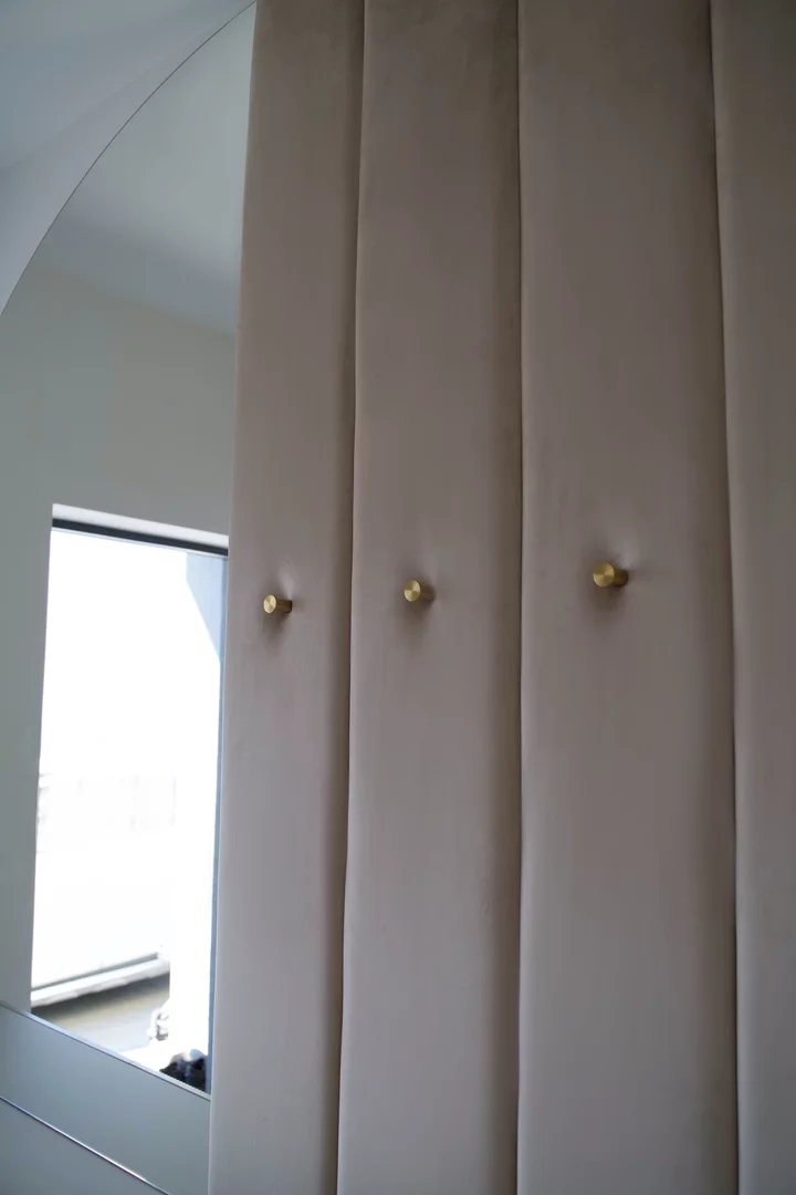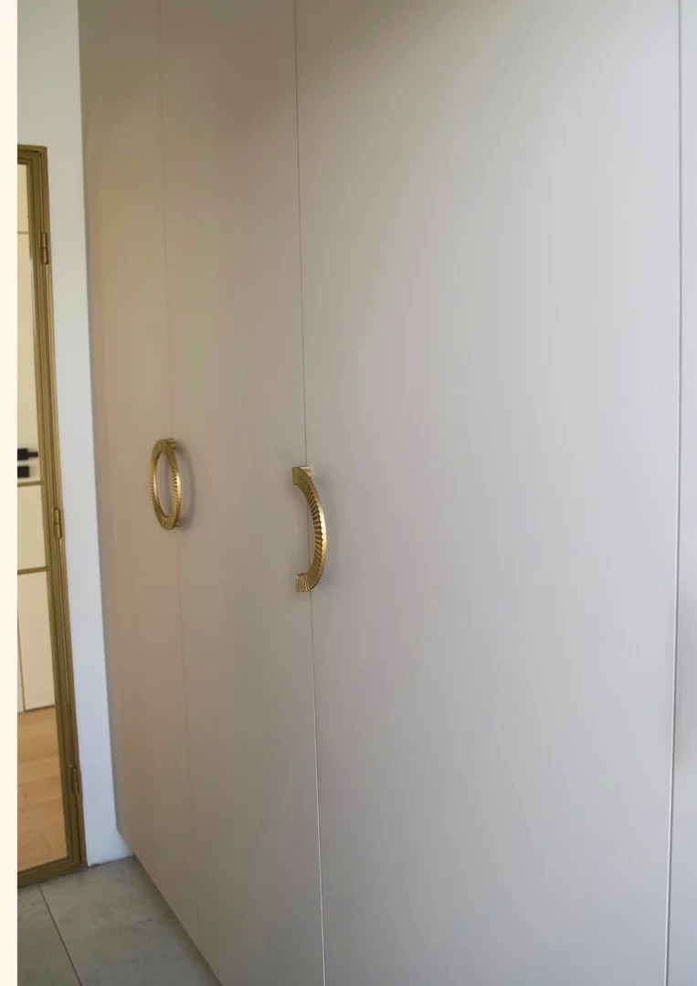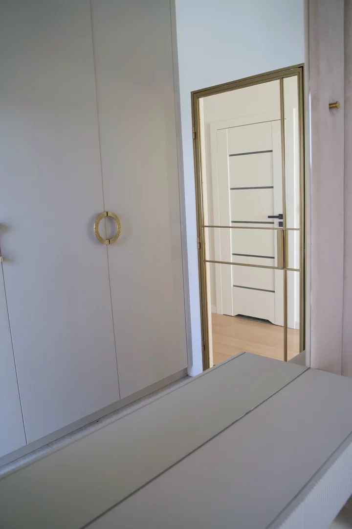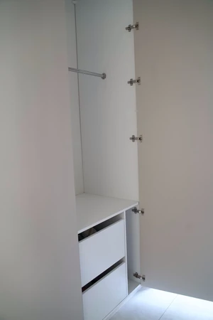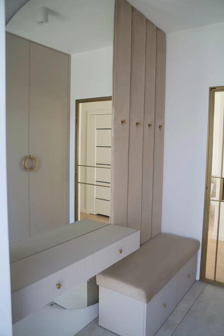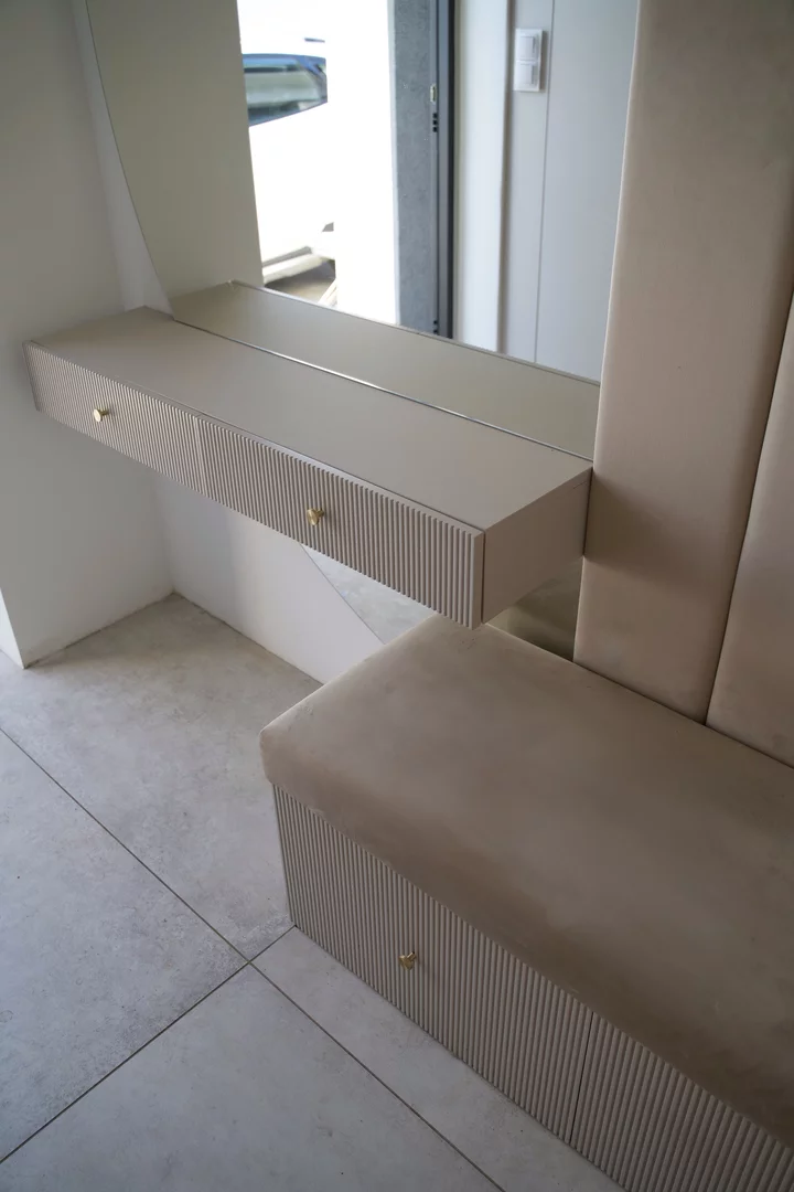 Prezentujemy szafę do przedpokoju z wbudowaną ławką i miejscem do wieszania ubrań, wykończonym zamszem, co zapewnia wygodę i funkcjonalność. Dodatkowo, lustro wkomponowane w szafę optycznie powiększa przestrzeń, tworząc jaśniejsze i bardziej przestronne wnętrze.